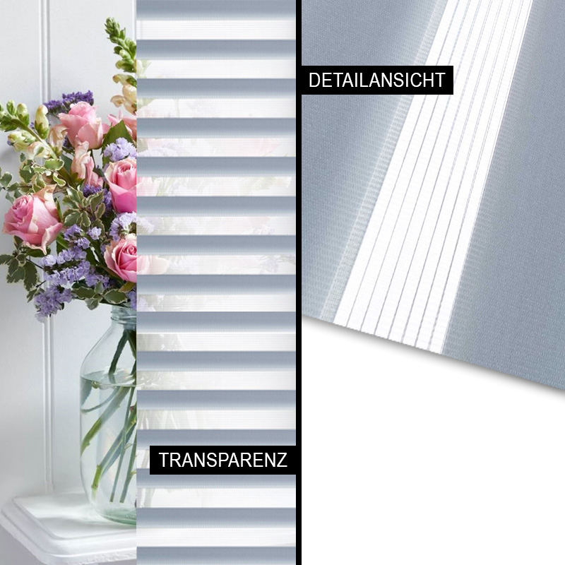 Der Stoff ist halbtransparent, was es ermöglicht, den Lichteinfall individuell zu regulieren. Durch die manuelle Anpassung der transparenten und blickdichten Streifen lässt sich der Doppelrollo optimal auf die jeweiligen Lichtverhältnisse einstellen, wodurch er ideal für verschiedene Wohnräume wie Wohnzimmer, Schlafzimmer oder Büros geeignet ist. Der Stoff bietet gleichzeitig Sichtschutz und lässt dennoch ausreichend Tageslicht in den Raum, was für eine angenehme, helle Atmosphäre sorgt.